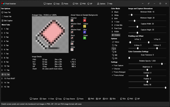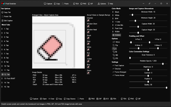 Save captured image to file as PNG (32 bit), ICO (32 bit), TEA (32 bit), or GIF (8 bit)
